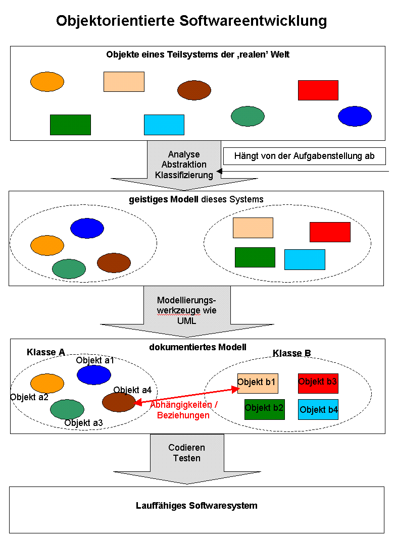 Da wir in der Informatik in Zukunft diese menschliche Denkweise anwenden werden, arbeiten wir mit konkreten Dingen (Informatik : Objekten) und der Zusammenfassung von Objekten zu sog. Klassen von Objekten. Wenn für ein vorliegendes Problem oder eine Aufgabe die Mittel der Informatik eingesetzt werden sollen, ist der erste Schritt hierzu die objektorientierte Analyse. Dabei geht es darum, die konkreten oder teilweise auch schon abstrakten Dinge der Wirklichkeit zu erkennen (Frage: welche Objekte sind vorhanden?) und darum, wie diese auf Grund ihrer Eigenschaften, ihrer Zusammensetzung und/oder ihrer Funktionalität zu Gruppen (Objektklassen) zusammengefasst werden können.