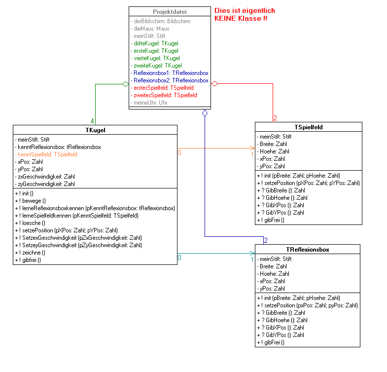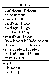 Der Dienst init ist der Constructor für Objekte der Klasse. Er erzeugt das eigentliche Objekt und alle die Objekte, welche das Ballspiel verwaltet. Hierfür ist es nötig, dass für jedes der am Ballspiel beteiligten Objekte ein Attribut zur Verfügung steht. Damit wird unsere Klasse TBallspiel zu: