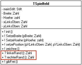 Die Steuerung in der Projektdatei lässt sich wesentlich vereinfachen, wenn das Spielfeld in der Lage ist, Fragen nach seinen Rändern selbst zu beantworten. Damit erhalten wir: