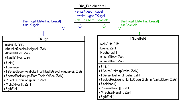 Im nun folgenden Diagramm ist die Beziehung der Klassen untereinander dargestellt, wobei die Projektdatei eigentlich kleine Klasse ist. Die Projektdatei erzeugt zwei Kugeln und ein Spielfeld. Damit besitzt sie diese Objekte. Wir sagen: sie hat zwei Kugeln und ein Spielfeld. Eine Hat-Beziehung wird durch eine Raute an der besitzenden Klasse - genauer am besitzenden Objekt - gekennzeichnet. Die kleine Zahl am anderen Ende der Beziehung gibt an, wie viele Objekte besessen werden.