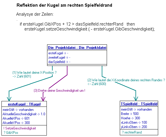 Zur Verdeutlichung der zentralen Stellung der Projektdatei analysieren wir noch einmal die Reflektion der Kugel am rechten Spielfeldrand. Hierfür erstellen wir ein Botschaftsdiagramm. In einem Botschaftsdiagramm sind nicht Klassen sondern Objekte und der Nachrichtenaustausch zwischen ihnen dargestellt: Die Pfeile stellen Nachrichten - Aufträge oder Anfragen - dar, deren Reihenfolge durch die Nummern am Anfang klargestellt wird: