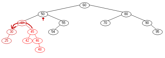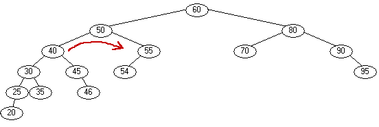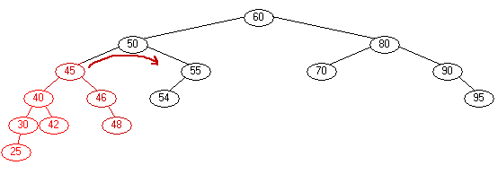 1. Fall: der äußere Teilbaum ist zu lang: Dieser Teilbaum ist oben in etwas hellerem Rot markiert. Hier genügt nun eine einfache Rotation nach innen (hier nach rechts) um die linkslastige Wurzel (hier 50)